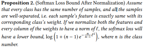 =0.45가 최대값이 된다. 즉, 아래 전제와 같이 softmax 에 의한 loss의 lower bound가 생기게 되고 최대 학습 성능이 낮아진다.