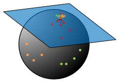 위 사진에서는 feature의 embedding 이후 layer인 softmax에서 학습과정을 담고 있는데, feature를 normalizing 했으므로 hyper sphere(현재는 figure로 나타내기 위해 3차원) 의 표면에 존재하고 확대해보면 검은색 점(weight)의 학습시 다른 모든 feature의 loss들의 gradient를 합산한곳으로 weight를 움직인다. 검은색점은 빨간색 class에 해당하는 weight이므로 loss의 gradient를 상징하는 vector들은 hypersphere의 tangential 한 vector로 나타난다. 특히, 빨간색 점들에는 가까이 가려는 vector들로, 초록색, 주황색은 멀어지려는 vector들로 나타나는데 이 모든 vector들을 합하여 움직인다.