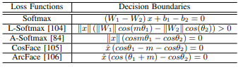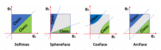 sphere face(Angular Softmax), cosface, arcface, Large-margin Softmax, additive softmax 등이 있는데 다들 직관과 방향이 비슷하므로 식과 decision boundary figure로 정리하겠다. 구체적으로 정리된 내용을 찾는다면 [1], [5]를 참조