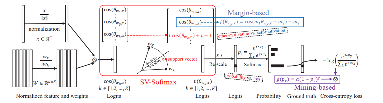~SV softmax는 위 그림에서 빨간 박스에 해당하는데, 해당위치에서 loss를 바꿈으로써 원래 Margin-based(파랑), Mining-based(보라)가 하는 역할을 one framework로 합쳤다.