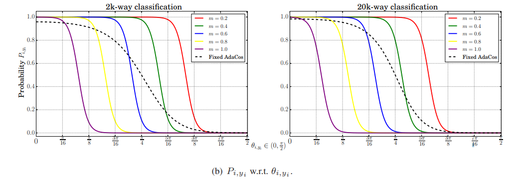 m이 클수록 조금만 틀려도(theta가 조금만 높아도) 많은 페널티를 부과하고 feature와 해당하는 class의 weight사이의 각도를 매우 작게끔 학습한다. 이것이 margin based softmax를 사용하는 이유이며 따라서 m은 클수록 좋지만 일정수준 이상의 m은 수렴문제를 발생시킨다. m이 지나치게 높을경우 theta 가 0과 매우 가까울때를 제외하고 모든 경우에서 loss를 부과하기 때문이다.
