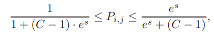(4)식에서 True class(분모에서 왼쪽항)는 완전히 다 맞추고(theta=0인 경우), Negative class(분모에서 오른쪽항)은 완전히 틀리다고 분리하는 경우(theta=pi/2)일때 lower boundary를 이루고 이와 반대상황 일때 upper bound를 얻는다. 참고로 C는 클래스의 총 갯수로, negative class는 총 C-1개이다.